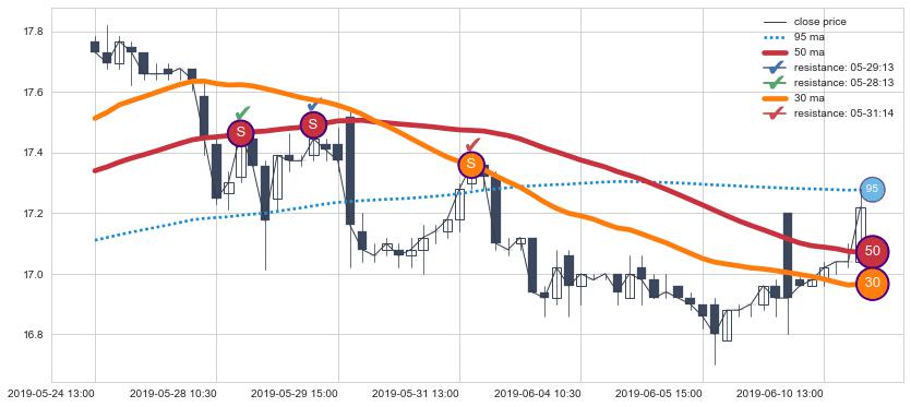 下跌趋势05-24 13:00-06-11 09:30,均线50, 30确认关键阻力3处