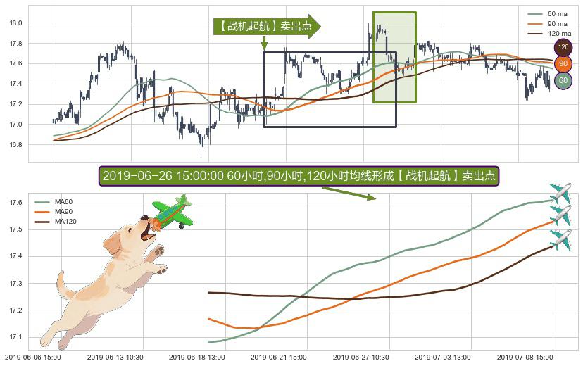 形态多维评估: ⚀ 2019-06-17 15:00:00小时-2019-07-08 15:00:00小时显现 60小时-90小时-120小时均线 【战机起航】卖出点 看空信号,后市看跌,卖出