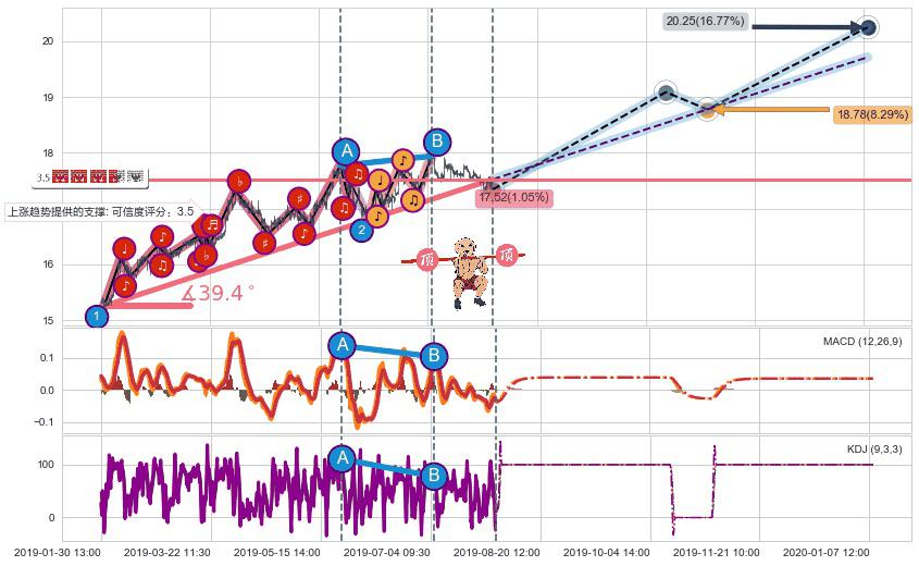 ♘ 阻力价格位17.85,可信任强度88.45%,距离最后交易2019-07-31 15:00形成的收盘价格17.34相差 +2.93%