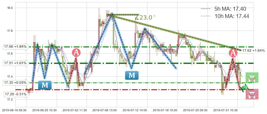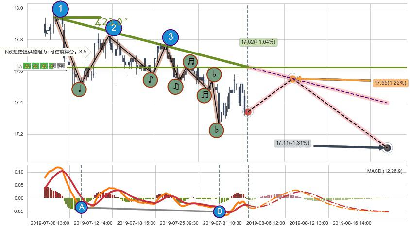 ➢ 预测:2019-08-07 11:00,【小幅反弹】稳定目前下跌趋势的前提下,预测价格:17.55