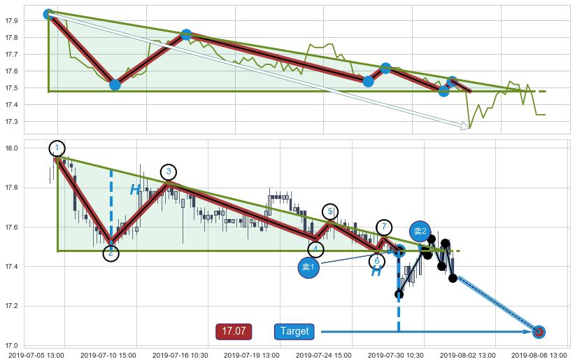 ➢ 【多方力量耗尽,空方打破攻守平衡点】下降三角形中继整理, 已在07-29:09突破【支撑】颈线 17.48 →演变成下降通道