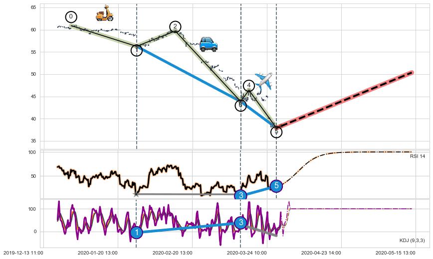 ➢ 第一, 三驱动浪端点:【KDJ】走势出现【常规背离 & 反转信号】背离程度55.90%,背离夹角角度59.4˚,背离程度中等