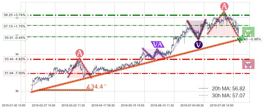 ♘ 阻力价格位57.13,可信任强度53.13%,距离最后交易2019-07-31 15:00形成的收盘价格56.15相差 +1.75%