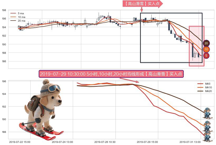 形态多维评估: ⚀ 2019-07-24 14:00:00小时-2019-07-31 14:00:00小时显现 5小时-10小时-20小时均线 【高山滑雪】买入点 看多信号,后市看涨,买入