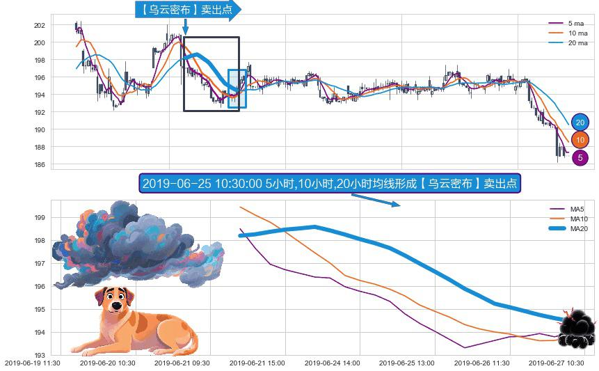 形态多维评估: ⚀ 2019-06-21 11:30:00小时-2019-06-27 09:30:00小时显现 5小时-10小时-20小时均线 【乌云密布】卖出点 看空信号,后市看跌,卖出