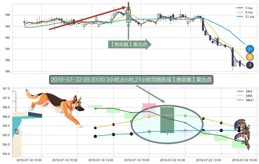 形态多维评估: ⚀ 2019-07-22 09:30:00小时显现 3小时-8小时-21小时均线 【绝命跳】卖出点 看空信号,后市看跌,卖出