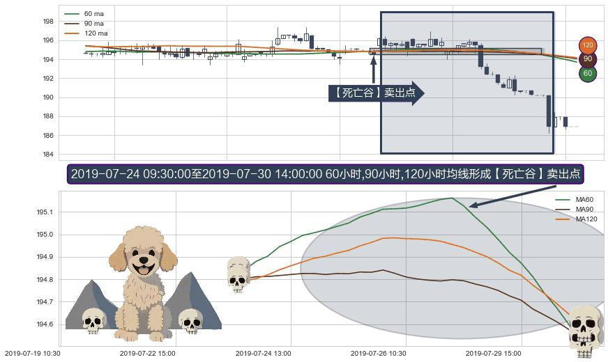 形态多维评估: ⚀ 2019-07-24 10:30:00-小时至2019-07-30 14:00:00-小时显现 60小时-90小时-120小时均线 【死亡谷】卖出点 看空信号,后市看跌,卖出