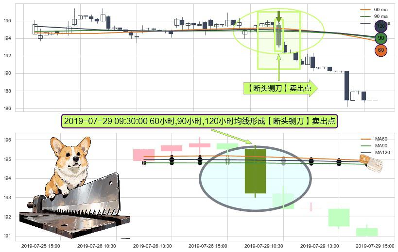 形态多维评估: ⚀ 2019-07-29 09:30:00小时显现 60小时-90小时-120小时均线 【断头铡刀】卖出点 看空信号,后市看跌,卖出