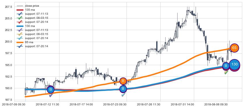 上涨趋势07-09 09:30-08-06 11:30,均线65, 130, 135确认关键支撑3处
