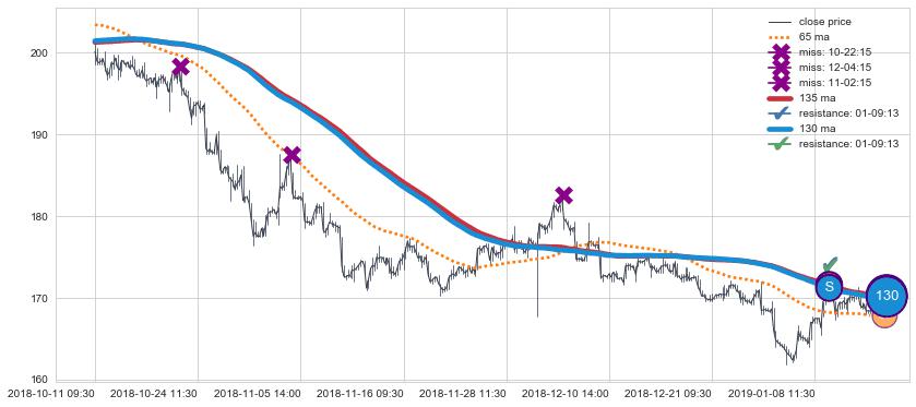 下跌趋势10-11 09:30-01-14 15:00,均线130, 135确认关键阻力1处