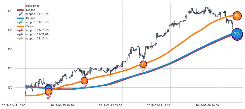 上涨趋势01-14 15:00-03-11 09:30,均线65, 130, 135确认关键支撑3处