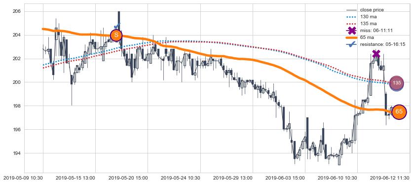 下跌趋势05-09 10:30-06-12 11:30,均线65确认关键阻力1处