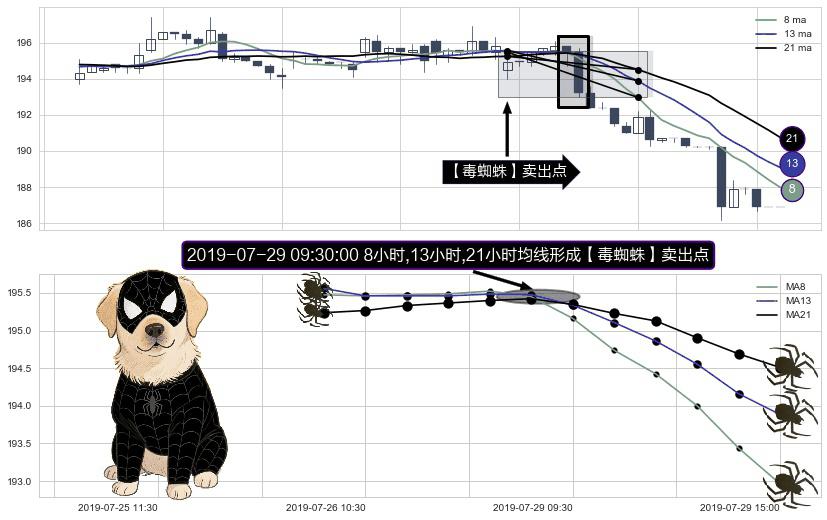 形态多维评估: ⚀ 2019-07-29 09:30:00小时显现 8小时-13小时-21小时均线 【毒蜘蛛】卖出点 看空信号,后市看跌,卖出