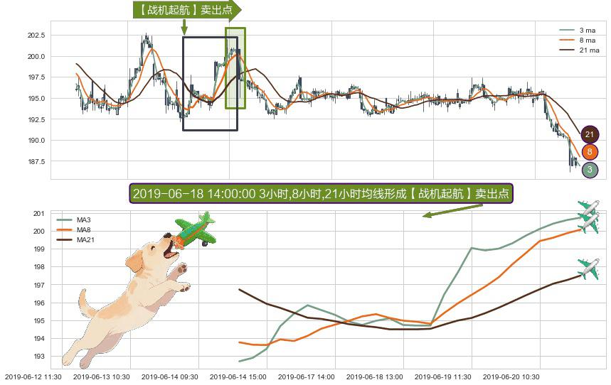 形态多维评估: ⚀ 2019-06-14 13:00:00小时-2019-06-20 14:00:00小时显现 3小时-8小时-21小时均线 【战机起航】卖出点 看空信号,后市看跌,卖出