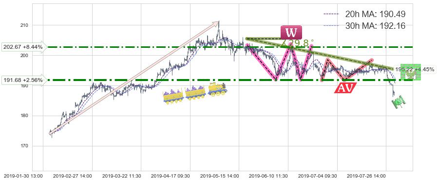 ♘ 阻力价格位191.68,可信任强度78.69%,距离最后交易2019-07-31 15:00形成的收盘价格186.90相差 +2.56%