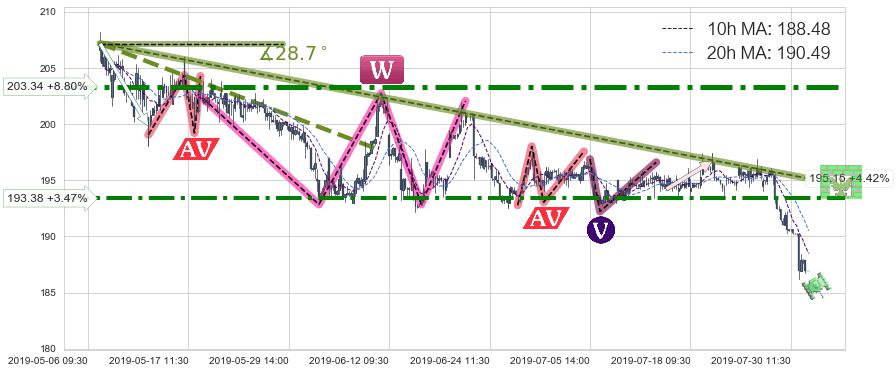 ➢ 预测:2019-08-23 14:00,【小幅反弹】稳定目前下跌趋势的前提下,预测价格:191.71