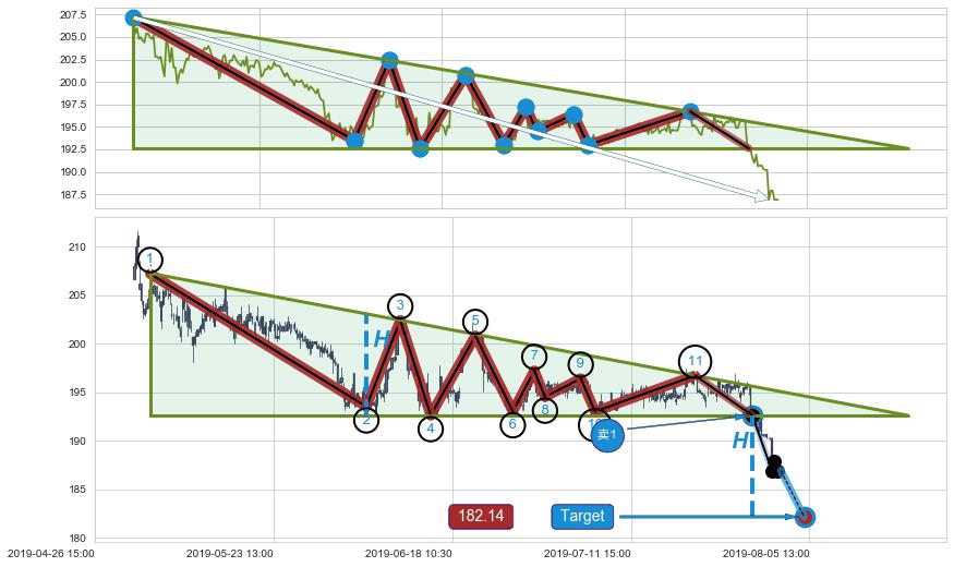 ➣ 【已确认突破】下降三角形整理 起点:05-07:09,突破点:07-29:10,形态共338交易小时