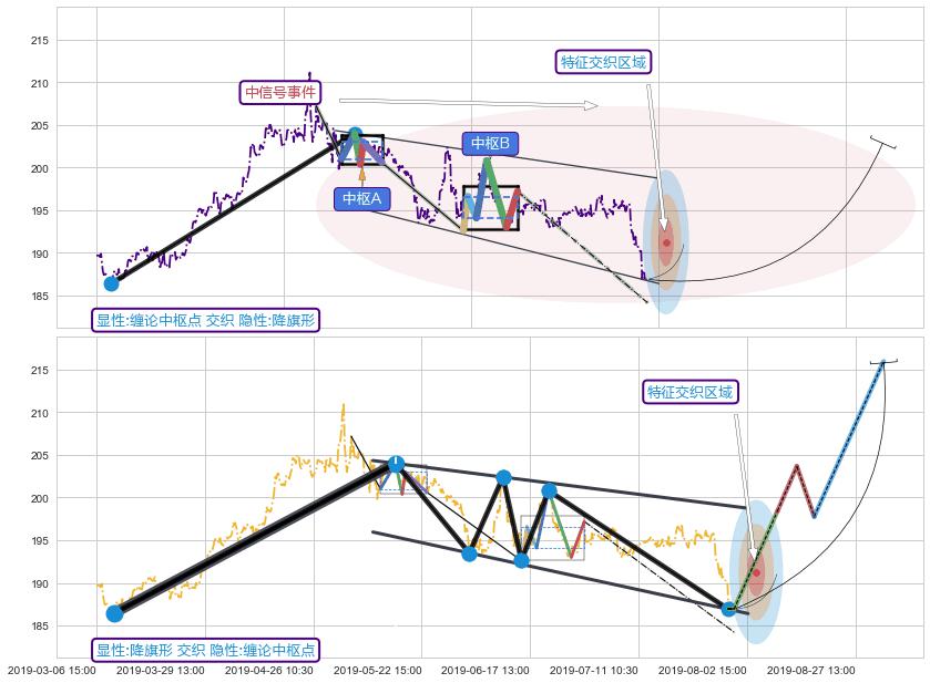 ➣ 【中枢A】:05-14:13-05-23:14,中枢由5笔构成,共44交易小时, ZG=203.00, ZD=201.02