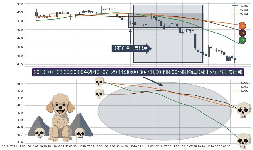 形态多维评估: ⚀ 2019-07-23 10:30:00-小时至2019-07-29 11:30:00-小时显现 30小时-60小时-90小时均线 【死亡谷】卖出点 看空信号,后市看跌,卖出