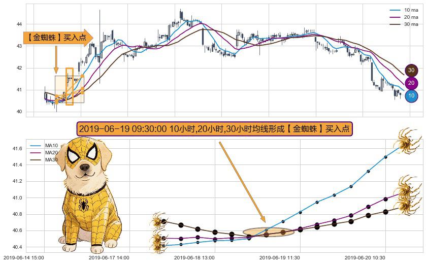 形态多维评估: ⚀ 2019-06-19 09:30:00小时显现 10小时-20小时-30小时均线 【金蜘蛛】买入点 看多信号,后市看涨,买入