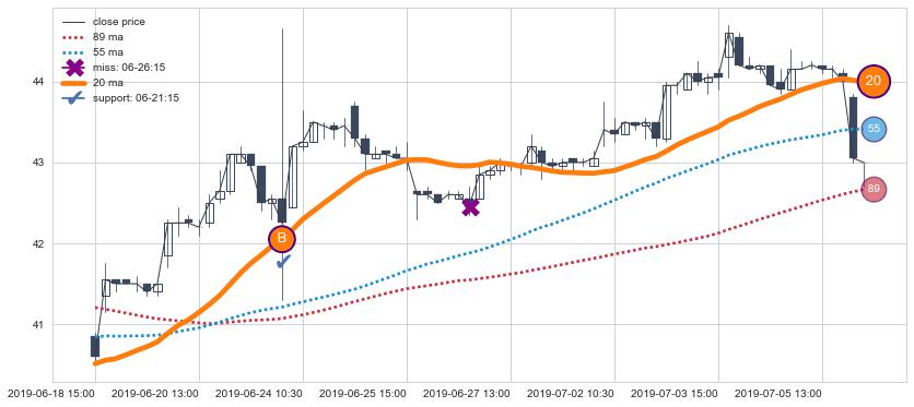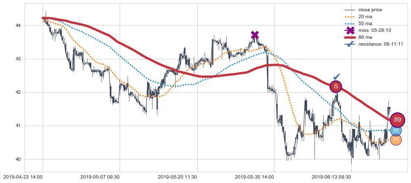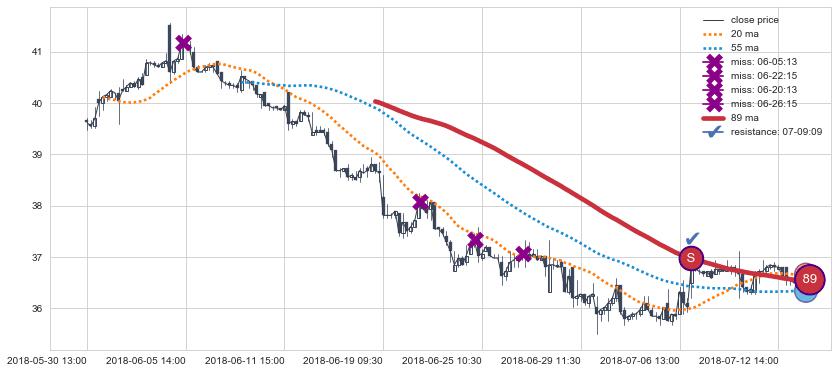下跌趋势04-23 14:00-06-19 10:30,均线89确认关键阻力1处