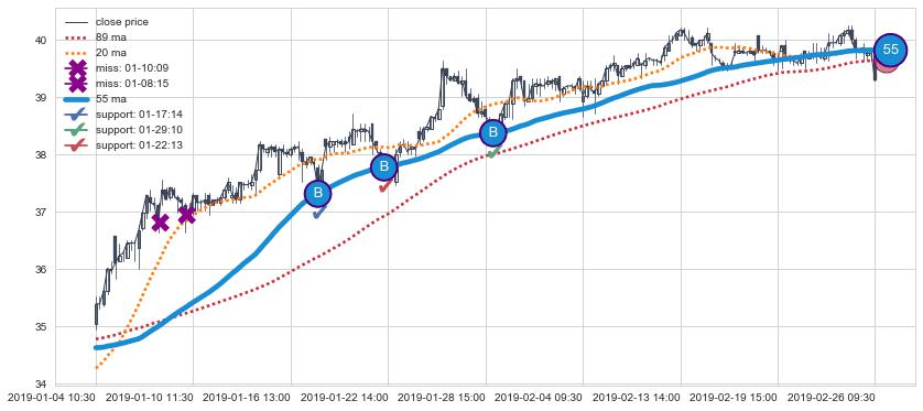 上涨趋势01-04 10:30-02-26 09:30,均线55确认关键支撑3处