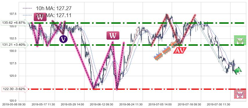♘ 阻力价格位131.21,可信任强度85.68%,距离最后交易2019-07-31 15:00形成的收盘价格126.90相差 +3.40%