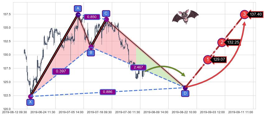 ➢ 接近预测D点位置, 随时警戒看涨【蝙蝠】形态反转启动