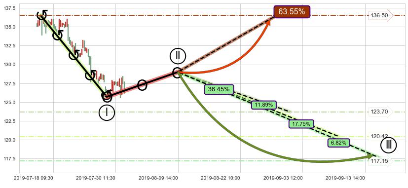 ➢ 循环浪继续向下【最高】位置(08-30:14, 123.70),匹配聚类样本比例32.60%, 可能性概率11.89%