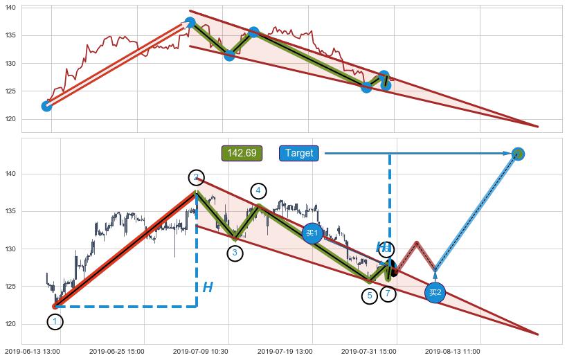 ➢ 最小中继整理涨幅→𝐇: 15.10 (𝐇楔型旗杆的长度:楔型起点→顶点)
