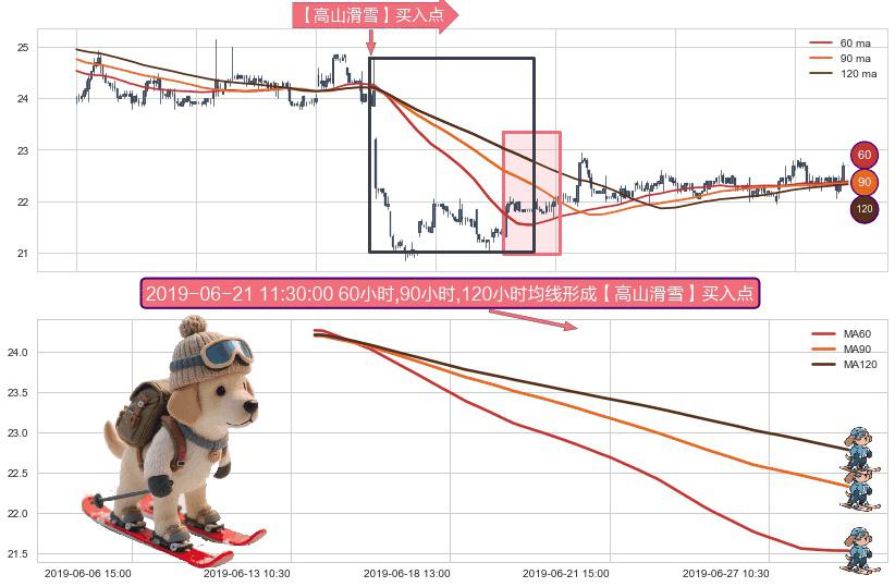 形态多维评估: ⚀ 2019-06-13 14:00:00小时-2019-06-28 15:00:00小时显现 60小时-90小时-120小时均线 【高山滑雪】买入点 看多信号,后市看涨,买入