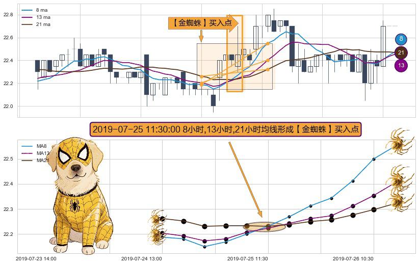 形态多维评估: ⚀ 2019-07-25 11:30:00小时显现 8小时-13小时-21小时均线 【金蜘蛛】买入点 看多信号,后市看涨,买入