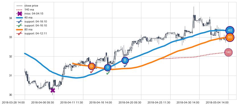 上涨趋势03-28 14:00-05-04 14:00,均线40, 80确认关键支撑3处