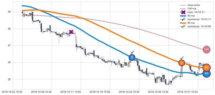 下跌趋势10-02 15:00-11-01 13:00,均线40, 80确认关键阻力2处