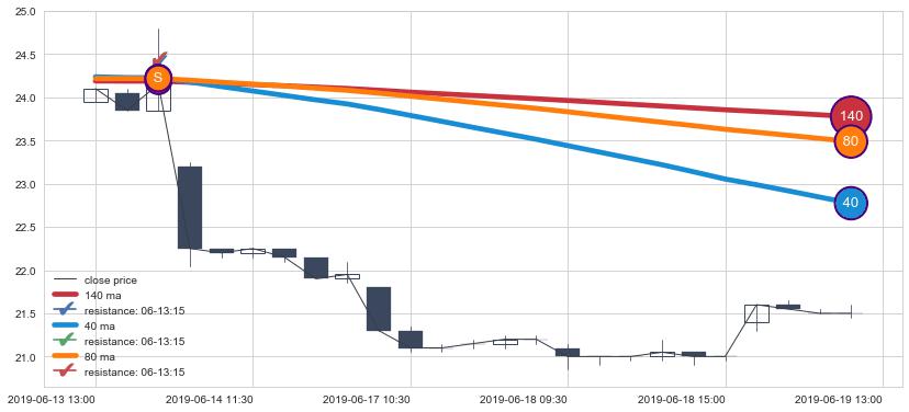 下跌趋势06-13 13:00-06-19 13:00,均线40, 80, 140确认关键阻力1处