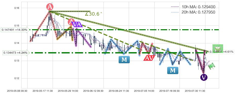 ♘ 在最后的下跌阶段2019-05-16 11:30至2019-07-30 09:30,存在 持续未破位的阻力位 ,阻力价格0.134951,可信任强度84.51%,其距离最后价格0.129000相差 +4.61%