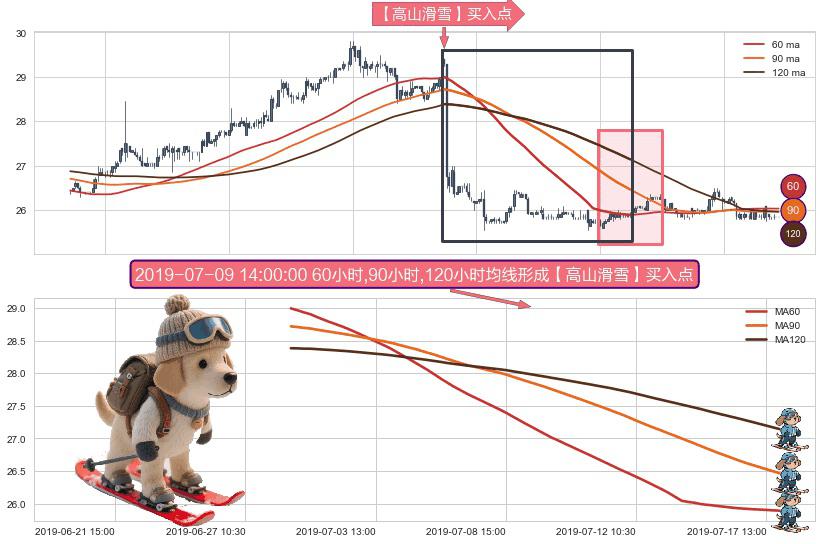 ⚀ 2019-06-28 11:30:00小时-2019-07-17 15:00:00小时显现 60小时-90小时-120小时均线 【高山滑雪】买入点 看多信号,后市看涨,买入