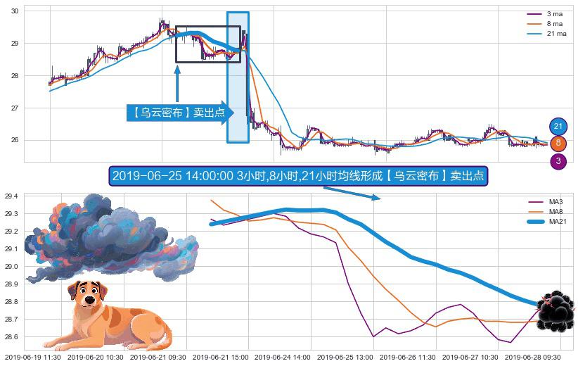 ⚀ 2019-06-21 11:30:00小时-2019-06-27 15:00:00小时显现 3小时-8小时-21小时均线 【乌云密布】卖出点 看空信号,后市看跌,卖出