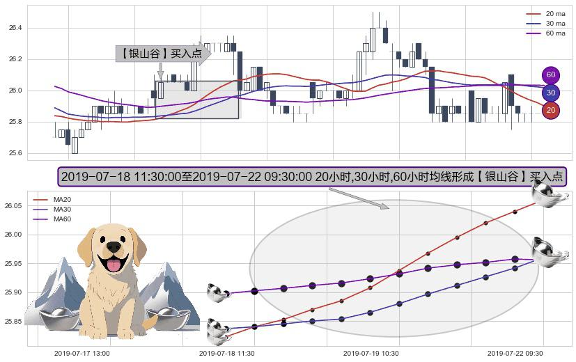 ⚀ 2019-07-18 13:00:00-小时至2019-07-22 09:30:00-小时显现 20小时-30小时-60小时均线 【银山谷】买入点 看多信号,后市看涨,买入