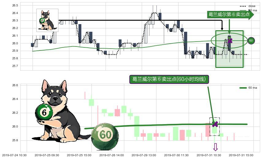⚀ 2019-07-31 09:30:00-小时显现 葛兰威尔均线 60小时均线 第⑥卖出点 走势反转见顶信号,后市看跌,卖出信号