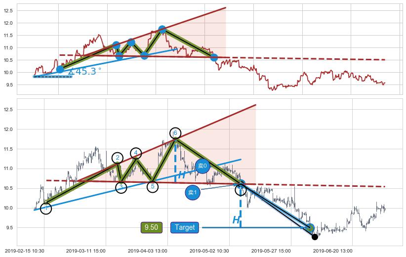 从2019-04-08 14:00至2019-06-06 10:30,共包含232个小时,阶段股价下跌-22.08%,阶段股价变动位移路程比: 1 : 4,下跌趋势角度: 54.0