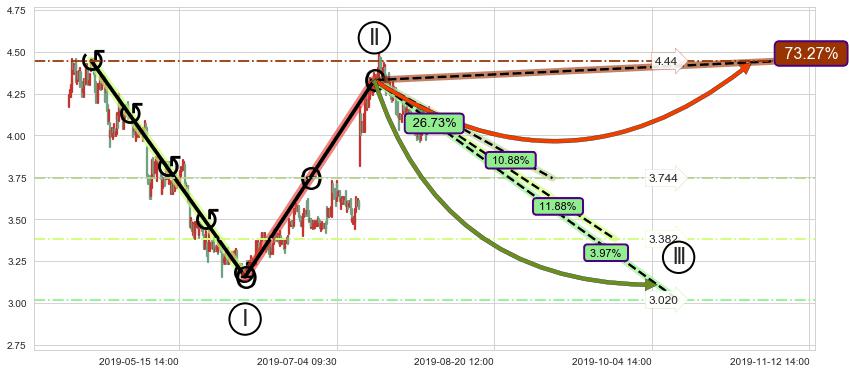 ➣ 调整浪已超过预测的c点位置,但后续大趋势循环浪高概率反转上涨,继续下跌概率26.73%,谨慎做空