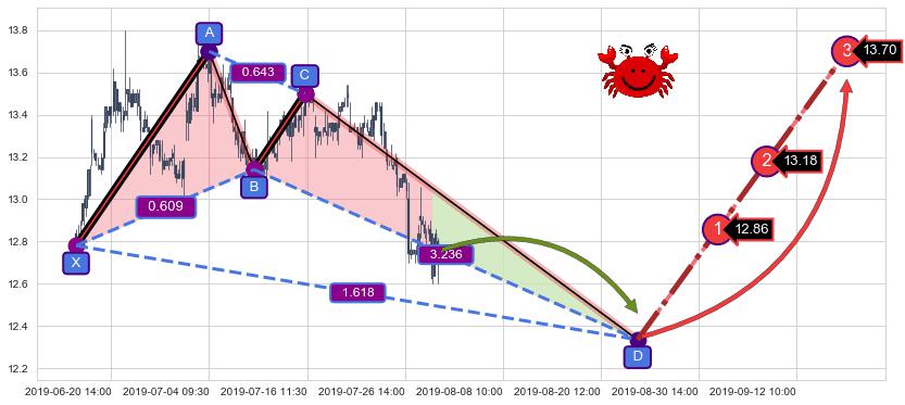 ➢ 距离预测D点位置尚有下跌空间,短线依然【看跌】, 耐心等待看涨【螃蟹】形态反转启动