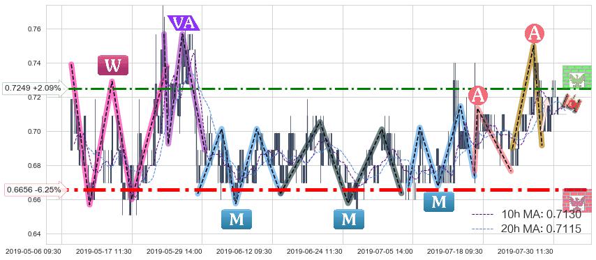 ♘ 阻力价格位0.7249,可信任强度56.75%,距离最后交易2019-07-31 15:00形成的收盘价格0.7100相差 +2.09%