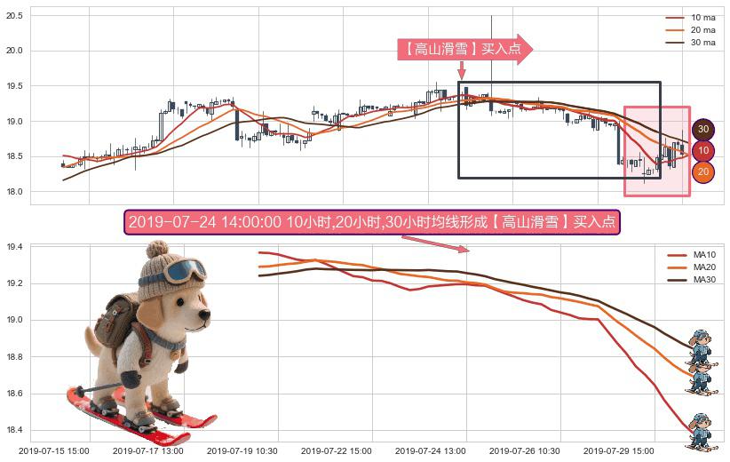 形态多维评估: ⚀ 2019-07-18 15:00:00小时-2019-07-30 13:00:00小时显现 10小时-20小时-30小时均线 【高山滑雪】买入点 看多信号,后市看涨,买入