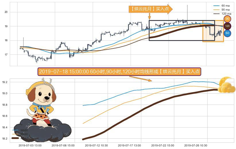 形态多维评估: ⚀ 2019-07-09 14:00:00小时-2019-07-29 15:00:00小时显现 60小时-90小时-120小时均线 【烘云托月】买入点 看多信号,后市看涨,买入