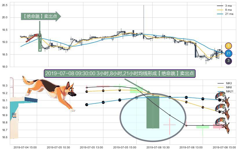 形态多维评估: ⚀ 2019-07-08 09:30:00小时显现 3小时-8小时-21小时均线 【绝命跳】卖出点 看空信号,后市看跌,卖出