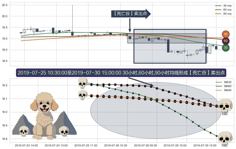 形态多维评估: ⚀ 2019-07-25 11:30:00-小时至2019-07-30 15:00:00-小时显现 30小时-60小时-90小时均线 【死亡谷】卖出点 看空信号,后市看跌,卖出