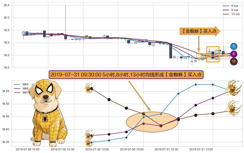 形态多维评估: ⚀ 2019-07-31 09:30:00小时显现 5小时-8小时-13小时均线 【金蜘蛛】买入点 看多信号,后市看涨,买入