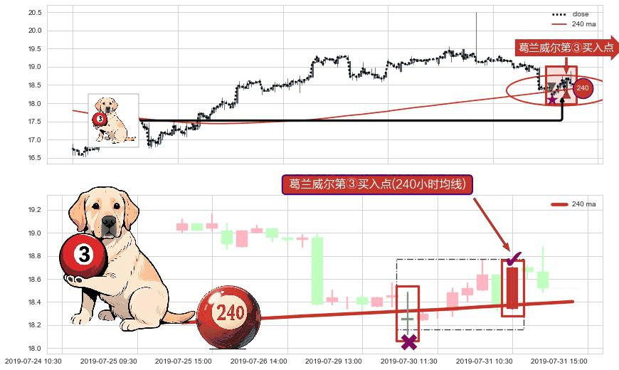 形态多维评估: ⚀ 2019-07-31 10:30:00-小时显现 葛兰威尔均线 240小时均线 第③买入点 上升趋势的中继信号,后市看涨,买进信号